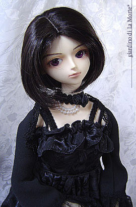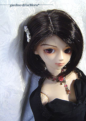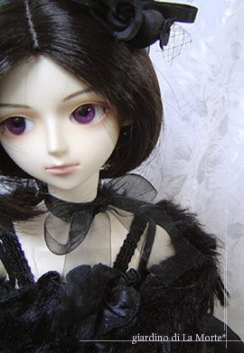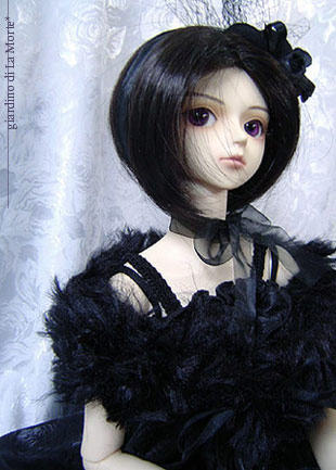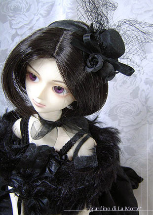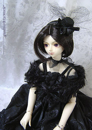 ヴェイルつきのドレスハットとファーのショールで。 クリーム色とはフリルの幅が違います。 |