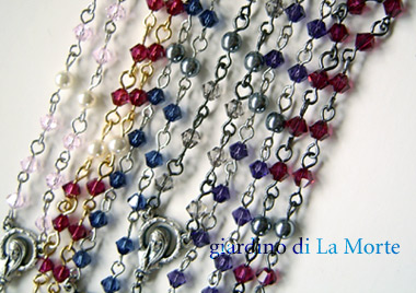 使用しているビーズは左から ・ロザリン ・ルビー(*金ロザリオ) ・ダークサファイア ・グレージュ ・パープルベルベッド ・ルビー …となります。